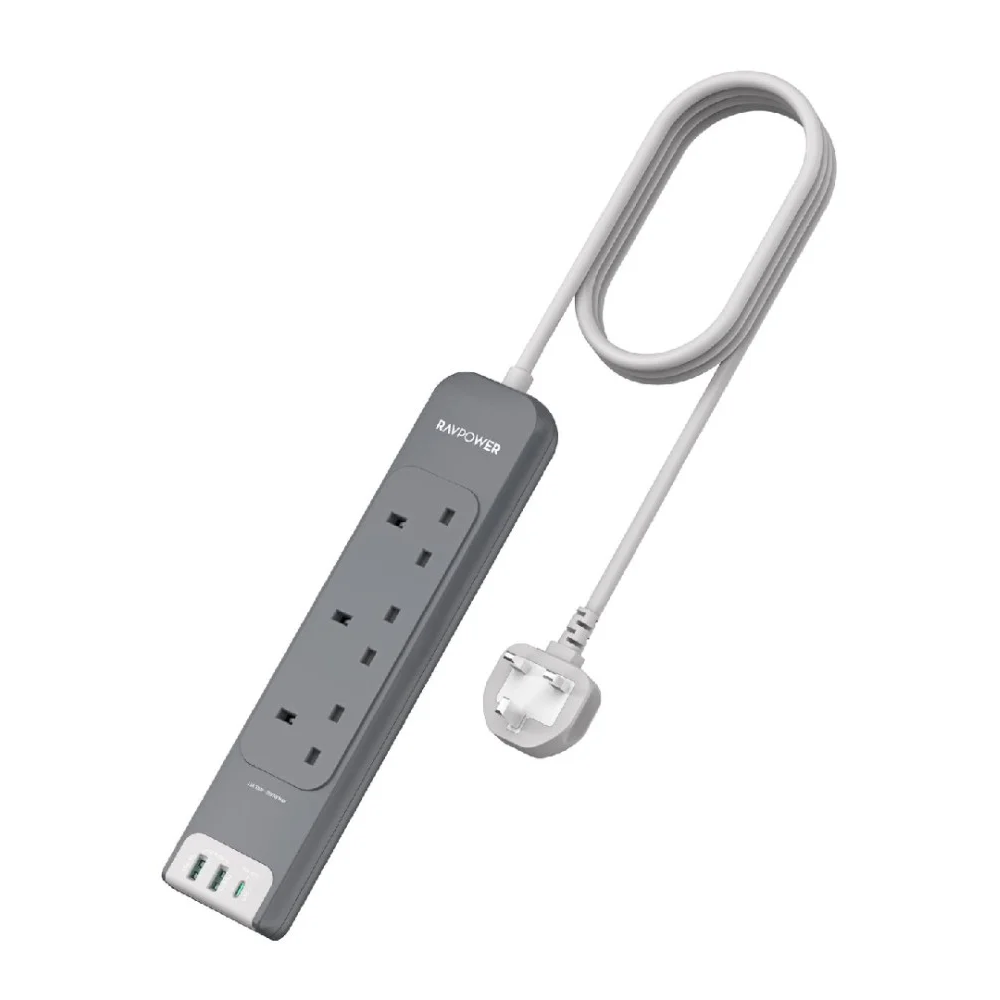 توصيلة كهربائيه راف باور 3 مداخل و 2 يو اس بي واحد تايب سي بطول 3 متر -رمادي