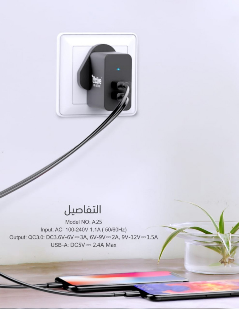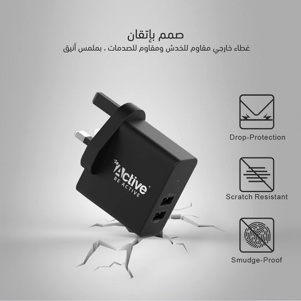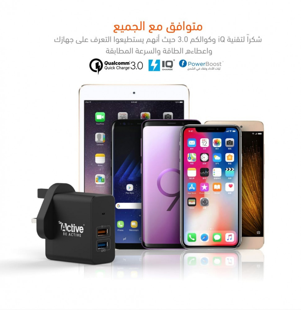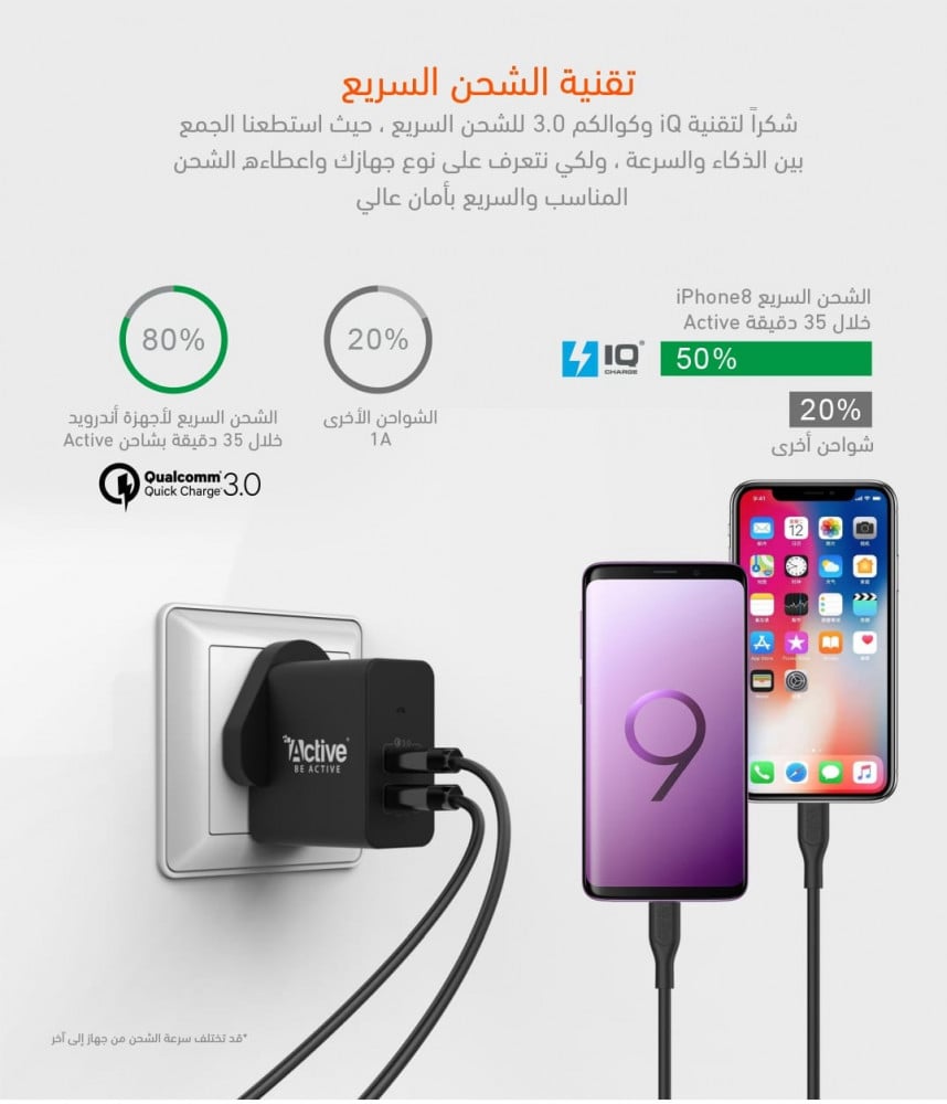 شاحن جداري Active A-25 منفذي usb كوالكوم 3.0 و IQ