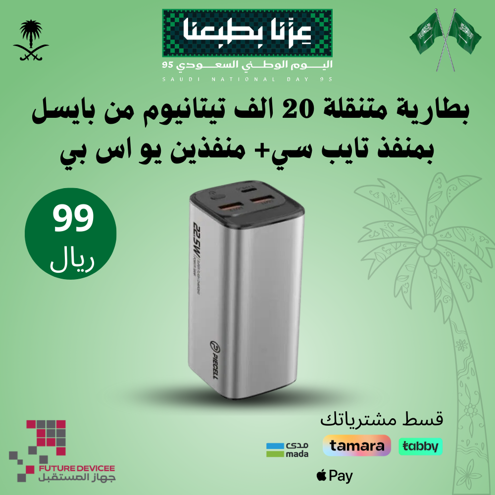 عروض اليوم الوطني- بطارية متنقلة بايسل 20الف أمبير – منفذ تايب سي + منفذين يو إس بي