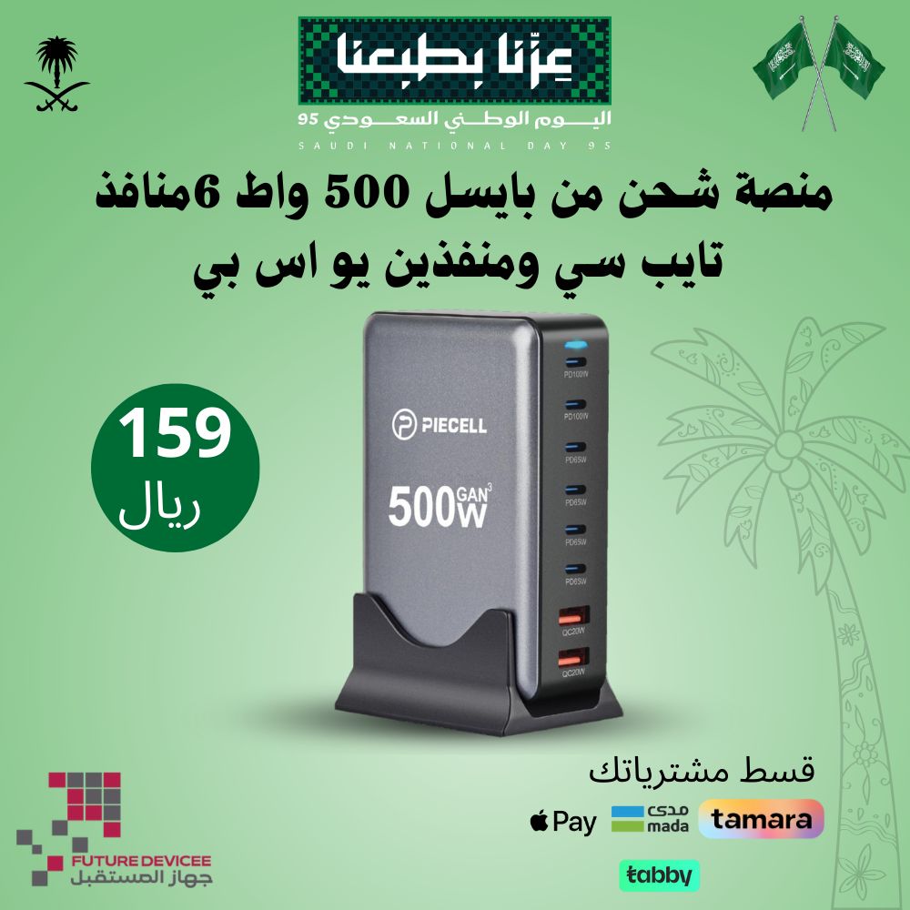 عروض اليوم الوطني - منصة شحن بايسل 500 واط – 6 منافذ تايب سي + يو اس بي